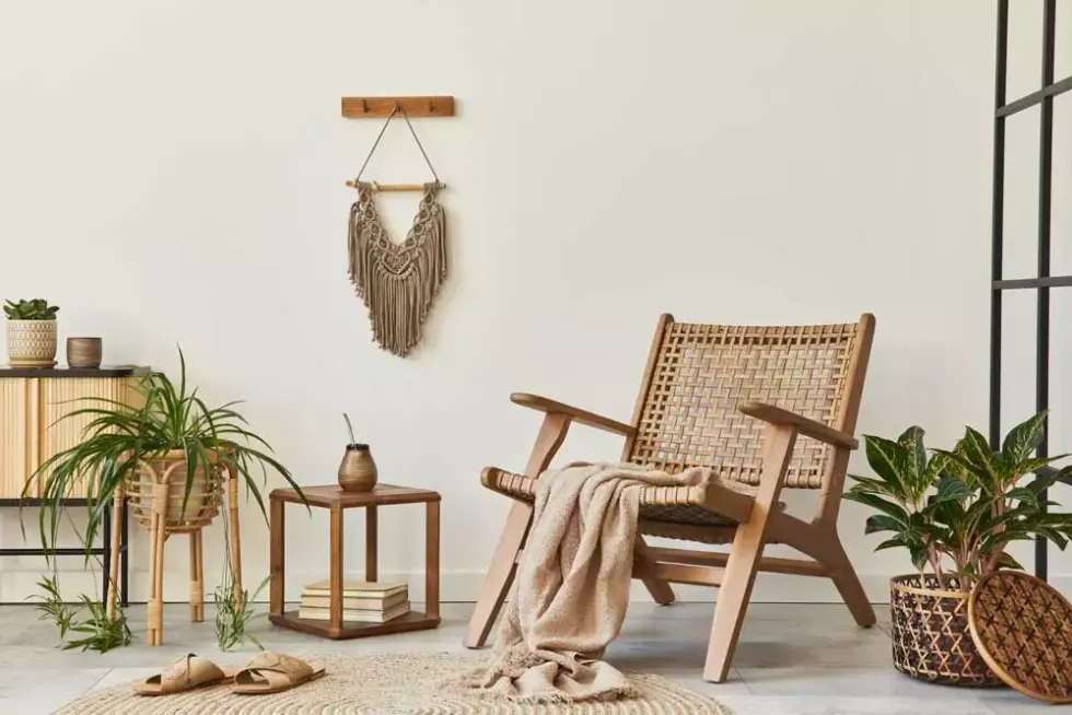 Una de las claves para adoptar el estilo boho en la decoración es incorporar elementos naturales y artesanales. Los materiales como el mimbre, el ratán, la madera y el macramé son fundamentales en este estilo, ya sea a través de muebles, accesorios decorativos o textiles.
