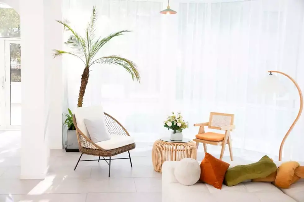 Otro material natural muy utilizado en verano es el mimbre. Podemos encontrarlo en sillas, mesas auxiliares o cestas decorativas. El mimbre aporta textura y un aire bohemio a los espacios, creando un ambiente relajado y veraniego.