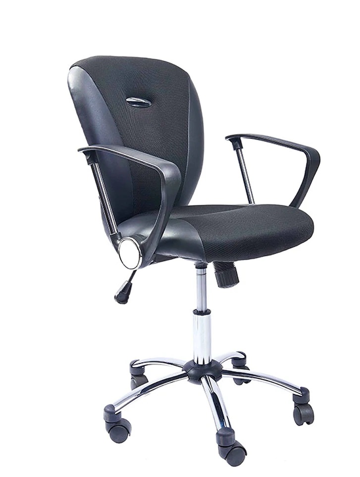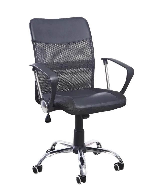 El tapizado del asiento y respaldar de esta silla giratoria combina el cuero sintético y la malla nylon en color negro. Para aportar un toque más elegante, la base de cinco puntas es cromada a juego con detalles incluidos en el reposabrazos.