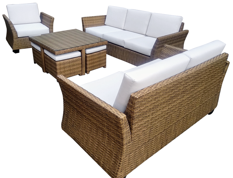 El ratán sintético también llamado Ratán Pe, ya que viene del polietileno, es una imitación al ratán natural, pero sin dejar de ser recomendado. Resistente al agua y todo tipo de ambientes, es igual de pedido que el natural ya que es de calidad, duradero y bastante estético contando con una gran lista de colores para elegir. Además, cuentan con una estructura sólida de aluminio o también acero.