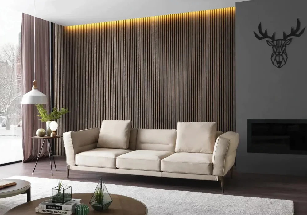 Nuestra exclusiva colección de Wall Panels para salas. Estos revestimientos acanalados son la tendencia número uno en interiorismo, diseñados para crear paredes de acento impactantes y añadir profundidad visual a tu espacio social. Fabricados en WPC (madera plástica) y PVC de alta gama, nuestros paneles ofrecen la estética cálida de la madera natural o la elegancia del mármol, pero con una durabilidad superior. Son la solución perfecta para destacar el muro detrás del sofá o diseñar un centro de entretenimiento (TV Wall) moderno y sofisticado.